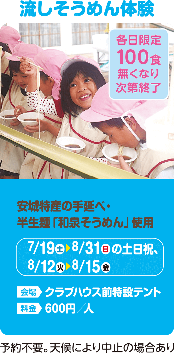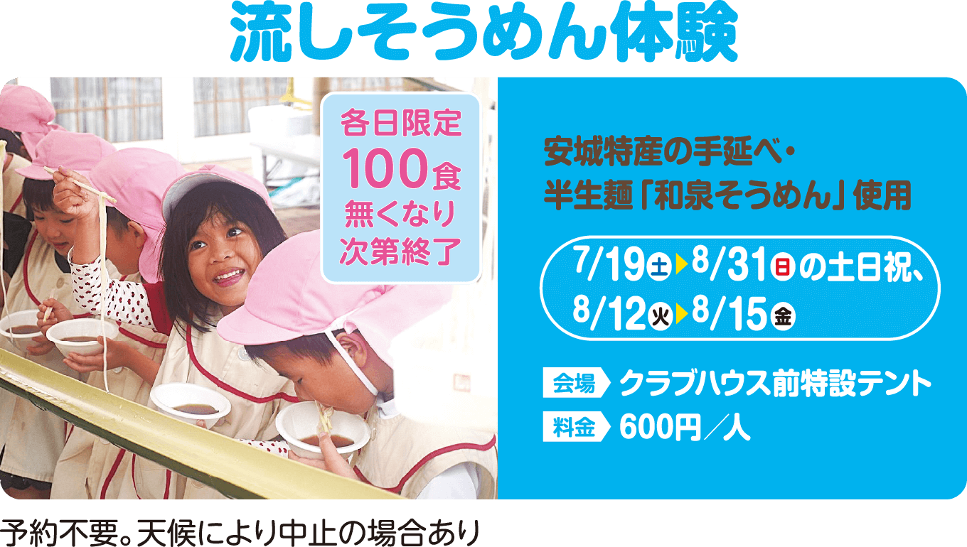 流しそうめんとジャブジャブ池を利用したくて入園しました。流しそうめんは先着100名だったため9:50にクラブハウスに行くとすぐに体験できました。そうめん自体がおいしく、ツルツルした食感がよかったため大満足です。じゃぶじゃぶ池はスライダーがあり、子供は何度も挑戦して楽しそうでした。