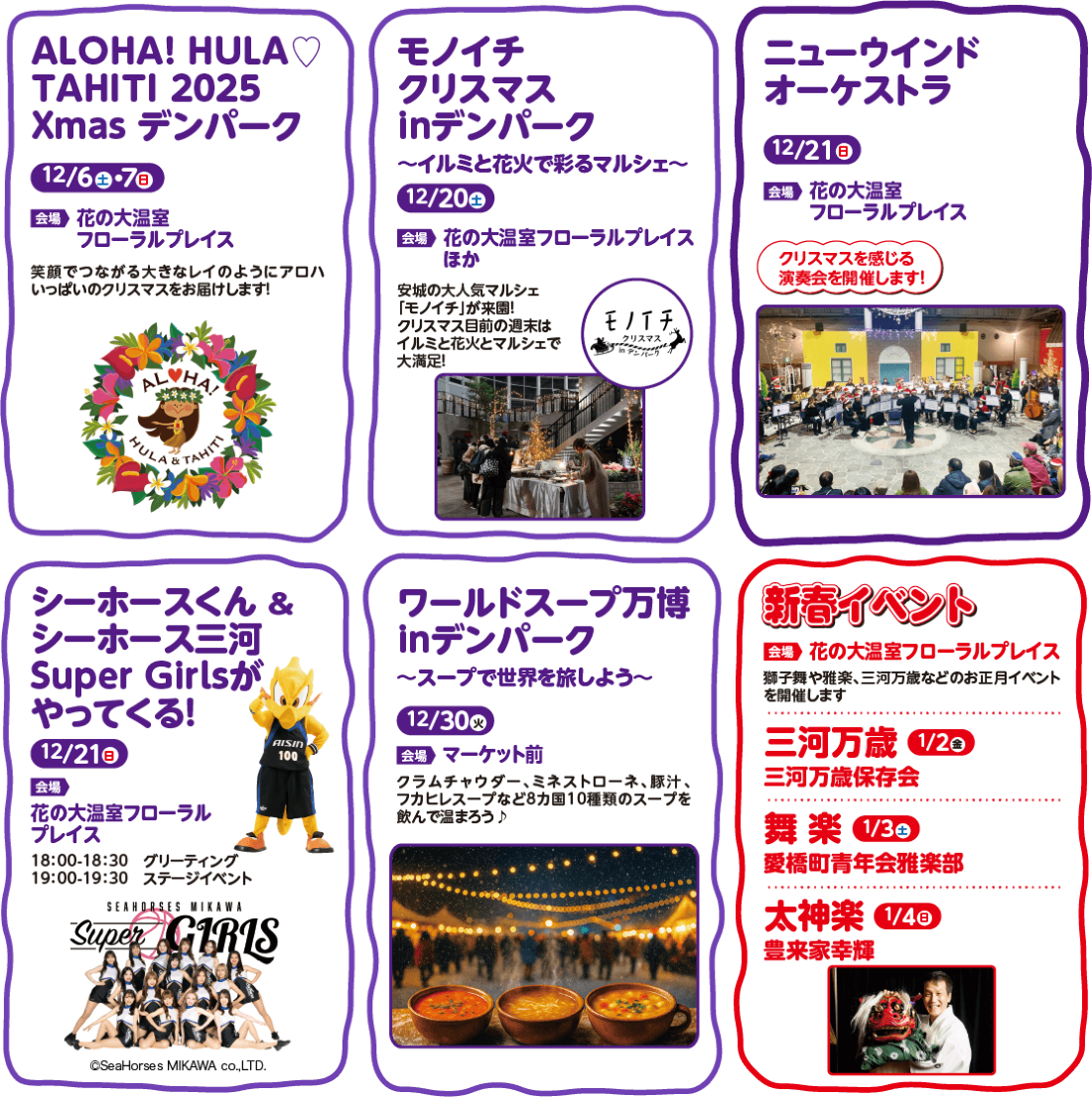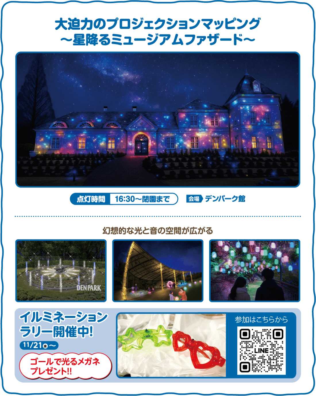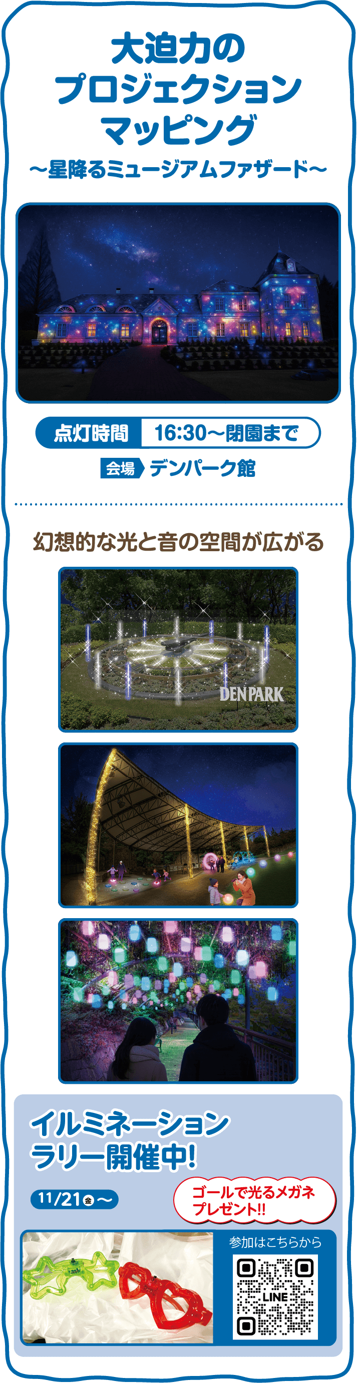 暖かいところで見られる、イルミネーション目的でいきました。外が暗くなっても、室内が明るいので、イルミネーションのキラキラ感は少なめですが、大きなツリーなどたくさんあって楽しめました。寒いけど、屋外の方がイルミネーション感はありました。カフェや軽食も色々あり、食べるスペースもたくさんあるのもよかったです。トイレは綺麗で、こどもも使いやすくありがたかったです。再入園もできるみたいで…機会があれば、また、違う季節にも行ってみたいと思いました。