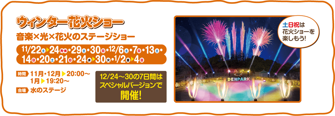 毎年、クリスマス前後に訪れています。8分間の短い間ですが花火に感激します。イルミネーションも、とってもロマンチックで美味しいソーセージもあります。お正月もやってます。