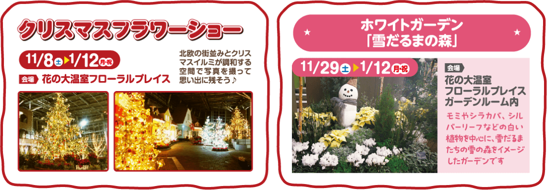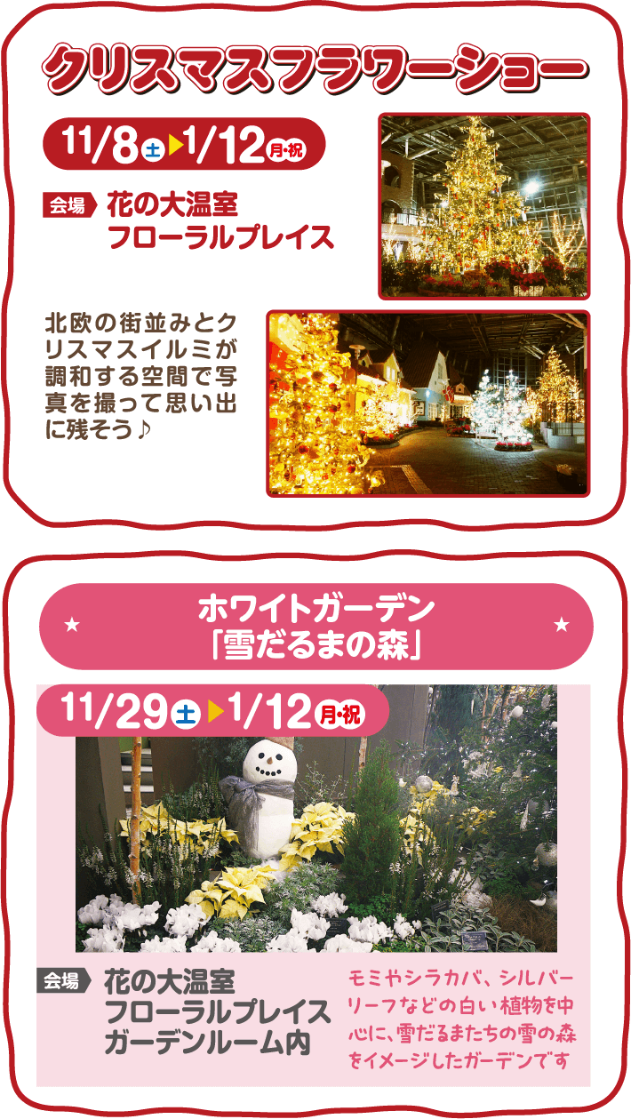 近いのでたまに行っています。自然が多く、子どもが喜ぶ遊具やイベントがあるのでいいですね。今はクリスマスなので温室の木に色々な装飾がしてあり、うきうきしました!