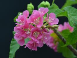 掲載:2026年01月19日 フローラルプレイス 人魚姫の池の前 ドンベヤは東アフリカからマダガスカル原産、アオイ科の熱帯花木です。ドンベヤ‘セミノール’(Dombeya ‘Seminole ’ )は、ドンベヤ・ブルゲシアエ(Dombeya burgessiae)をもとに作出された交配種で、明るくきれいなピンク色の花がブーケのような半球状にかたまり、上向きに咲くのが特徴です。